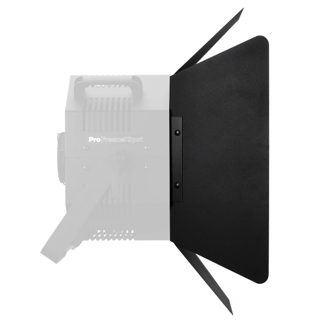 De Barndoor for ProFresnel Spot is vervaardigd uit hoogwaardig metaal dat bestand is tegen hoge temperaturen. Het ontwerp is compact maar robuust, met soepel bewegende kleppen die stevig blijven staan. Dit accessoire is licht genoeg voor mobiel gebruik, maar sterk genoeg voor dagelijks professioneel werk.