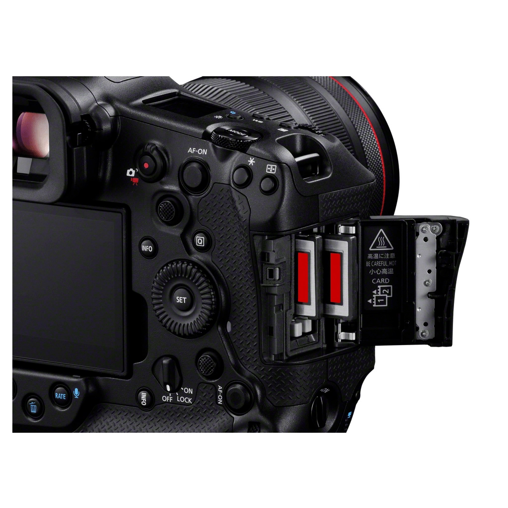 De Canon EOS R1 heeft een 9.44m-dot OLED EVF met een vergroting van 0.9x voor comfortabel, helder en scherp beeld op ooghoogte. De camera is stof- en waterbestendig met een magnesiumlegering behuizing, en heeft een geïntegreerde verticale grip voor verbeterde ergonomie. De R1 is voorzien van dual CFexpress Type B geheugenslots voor hoge snelheid en hoge bit-rate opnamemodi.
