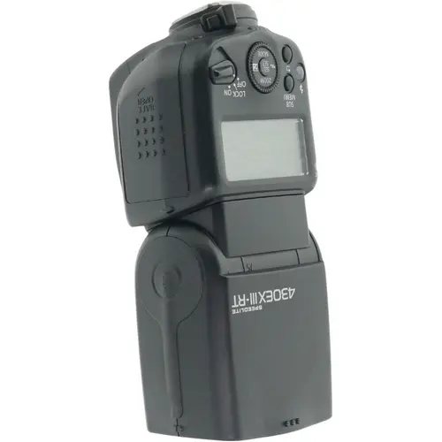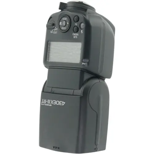 Canon Speedlite 430EX III-RT flitser met richtgetal 43, draadloze radio- en optische bediening en snelle recyclingtijd in een compact ontwerp. Conditie: Deze flitser werkt naar behoren, rondom zijn er wat gebruikerssporen te vinden.