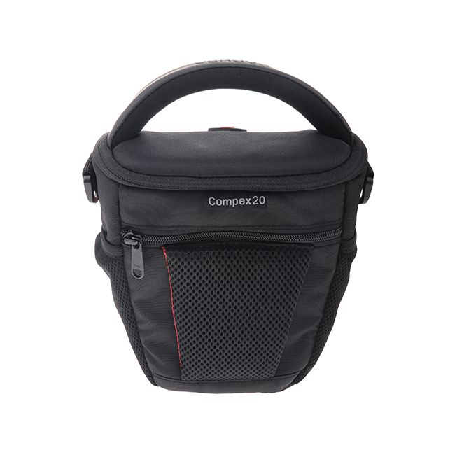 De Caruba Compex 20 is een compacte cameratas met bovenop een grote, stevige handgreep. De tas weegt slechts 312 gram, is voorzien van een riemlus en heeft een afneembare schouderriem. Ook is er een speciale regenhoes bijgeleverd.