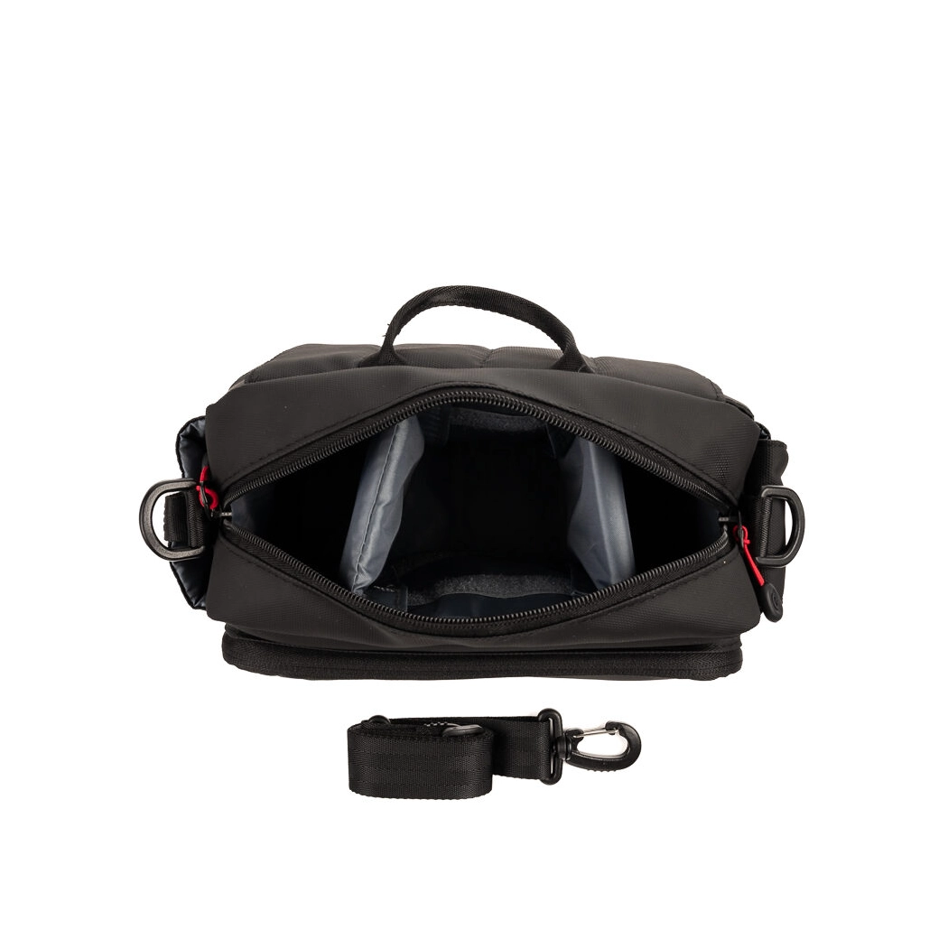 Het slimme ontwerp van de tas biedt een volledig aanpasbaar interieur met verplaatsbare dividers. Dit zorgt ervoor dat je jouw camera, lenzen en accessoires precies zo kunt organiseren als jij dat wilt. Of je nu een compact systeemcamera of een DSLR hebt, alles vindt zijn plek.