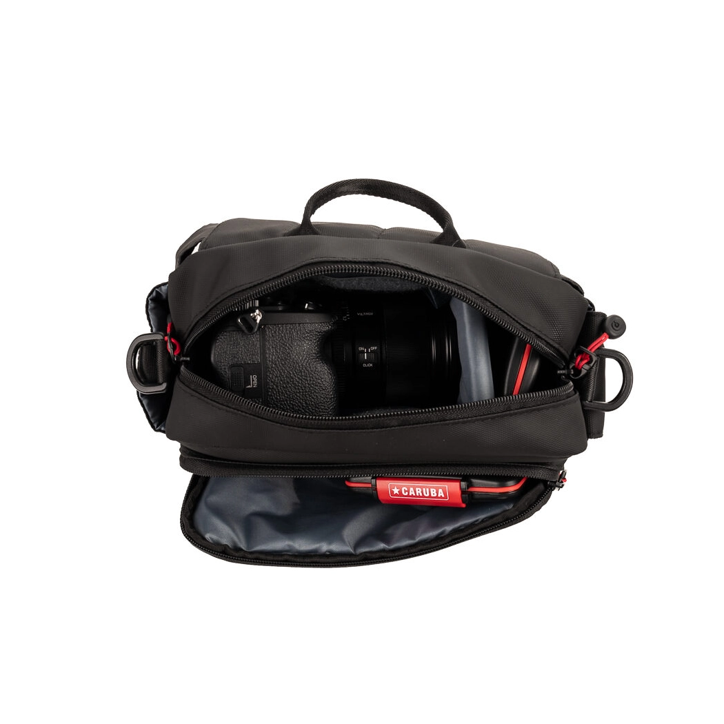 Voor extra gemak heeft de tas een handig voorvak met rits voor kleine accessoires zoals geheugenkaarten en accu’s. Aan de buitenkant vind je twee open zijvakken voor snelle toegang tot kleinere items. Met de Caruba Compex Switch 100 heb je altijd alles binnen handbereik.