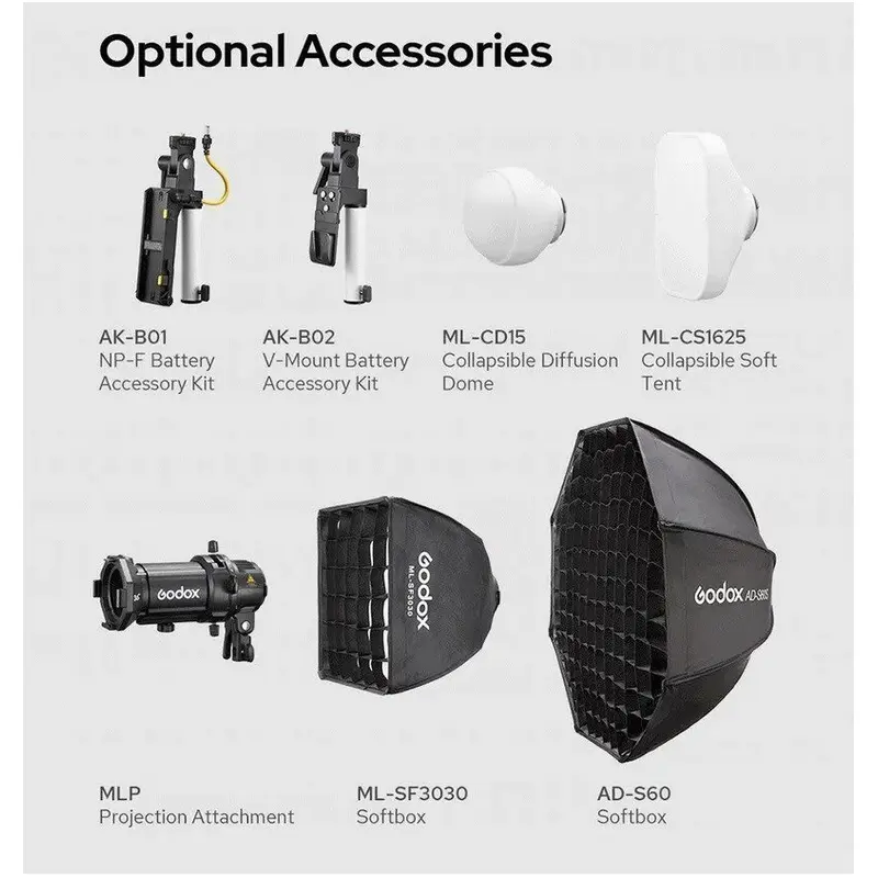 De lamp werkt op de meegeleverde voedingsadapter (100-240V) of op optionele NP-F970 lithium-ion accu’s voor gebruik op locatie zonder stroomnet. Bovendien is de lamp compatibel met alle Godox Mount-accessoires voor softboxen, reflectors en grids voor uitgebreide verlichtingscontrole.