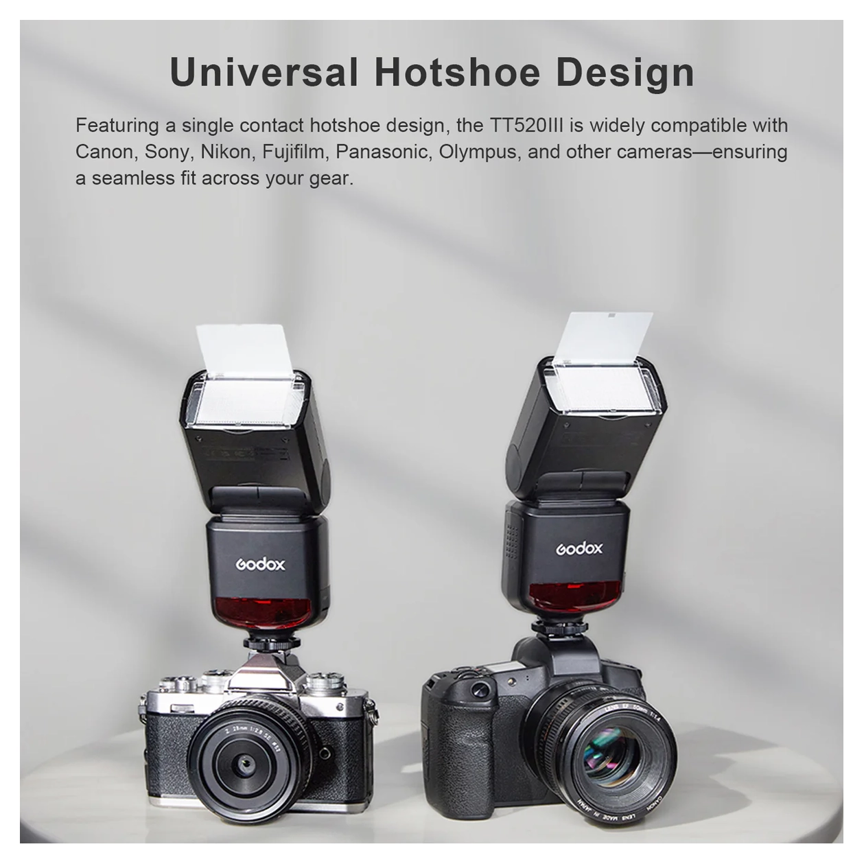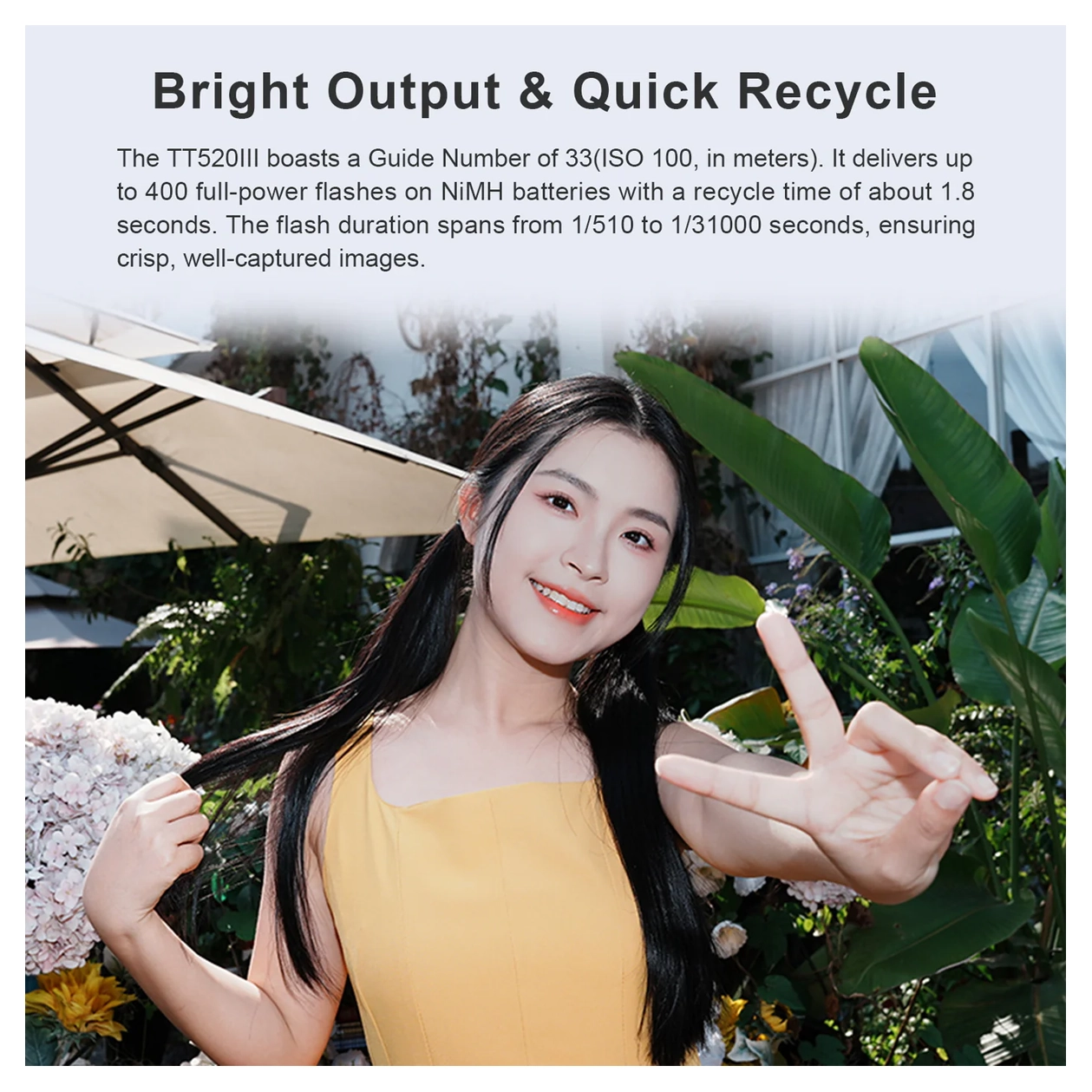 Batterijen vervangen gaat snel dankzij het slimme compartiment voor vier AA NiMH batterijen. De recycle time is slechts 1,8 seconde en je haalt tot 400 flitsen uit één lading. De TT520III is compatibel met Godox AK-R1 accessoires voor extra creatieve effecten. Met de meegeleverde mini-stand en handige opbergtas is hij meteen klaar voor gebruik.