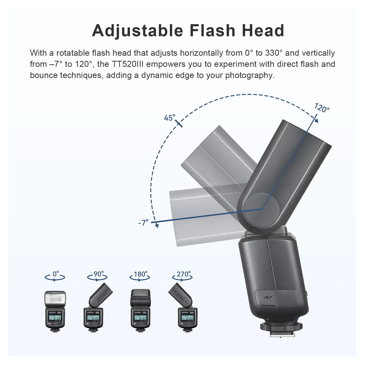 De Godox TT520III geeft je alle vrijheid om licht volledig naar jouw hand te zetten. Met een richtgetal van 33 (ISO 100) en een draaihoek van -7° tot 120° verticaal en 0° tot 330° horizontaal pas je de flitser perfect aan elke situatie aan. Dankzij de 16 kanalen op 433MHz communiceert hij moeiteloos met de meegeleverde RT-16 trigger, tot wel 30 meter afstand. Ideaal voor dynamische shoots, zowel binnen als buiten.