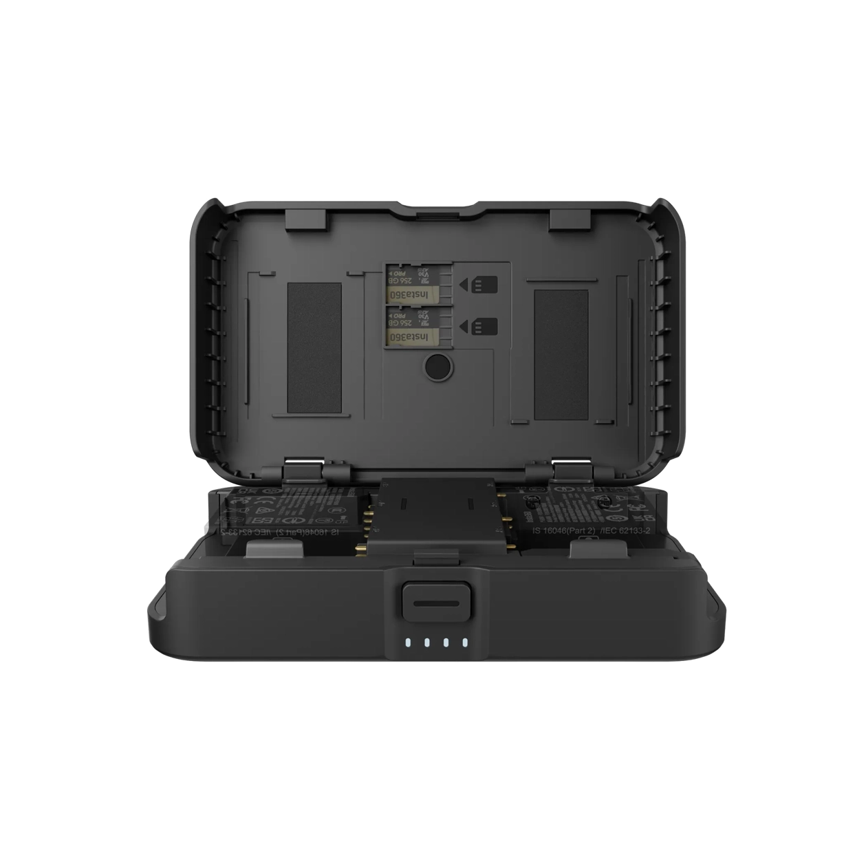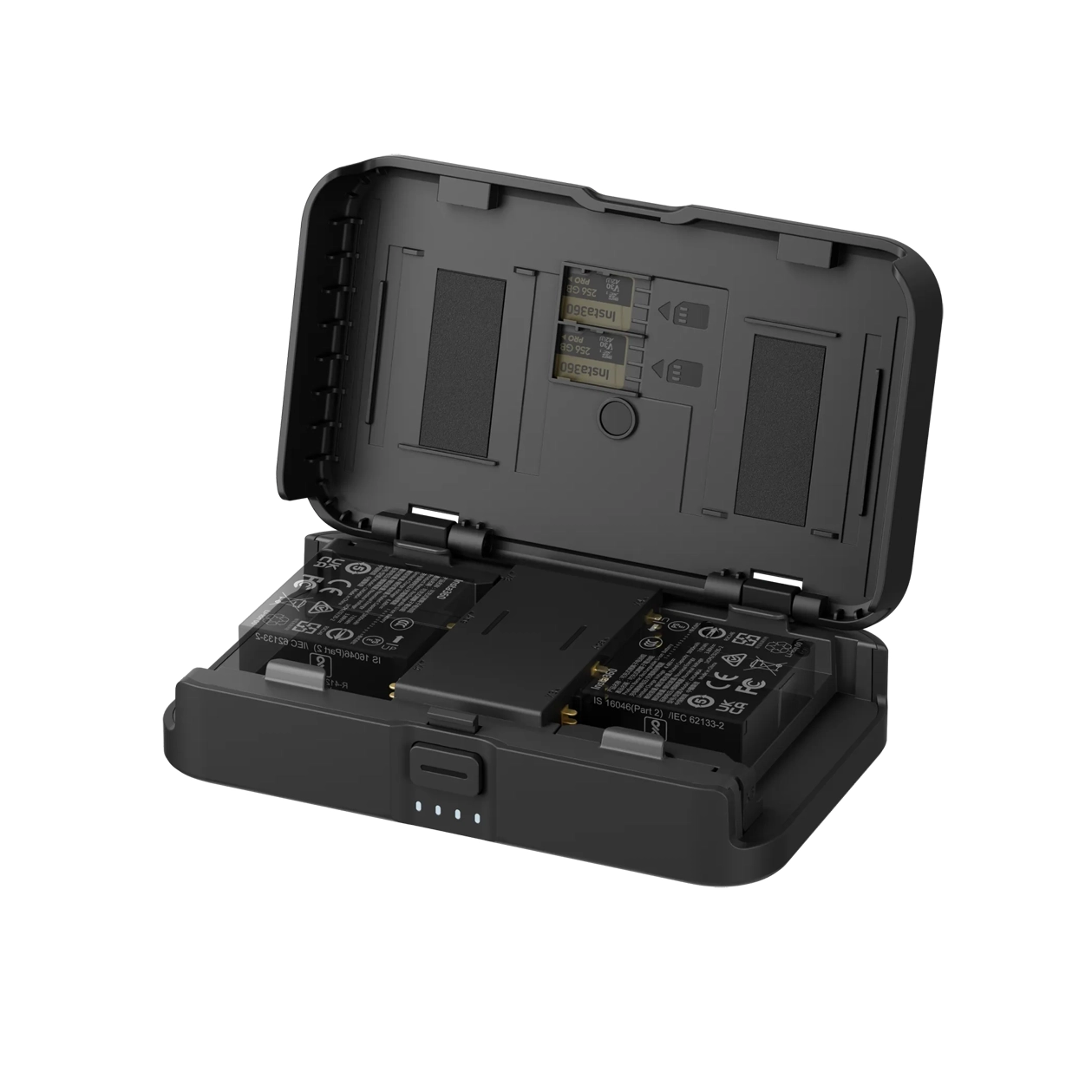 De Portable Charging Case biedt een handige manier om je Insta360-camera’s onderweg van stroom te voorzien. Met ruimte voor twee batterijen en twee microSD-kaarten kun je je apparatuur makkelijk opladen en georganiseerd houden, waar je ook bent. De ingebouwde 10.000mAh batterij zorgt voor een continue stroomvoorziening, zodat je nooit zonder power komt te zitten tijdens je avontuur.
