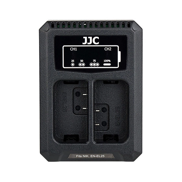 De JJC DCH-ENEL25 USB Dual Battery Charger maakt het opladen van twee Nikon EN-EL25 accu’s tegelijk eenvoudig. Dankzij de USB-poort kun je opladen via netstroom, laptop, powerbank of autolader. Of je nu thuis bent of onderweg, je accu’s zijn altijd gereed voor gebruik.