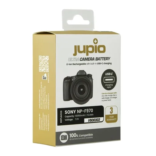- Inhoud verpakking: 1x Jupio NP-F970 ULTRA C accu, 1x USB-C naar USB-A kabel