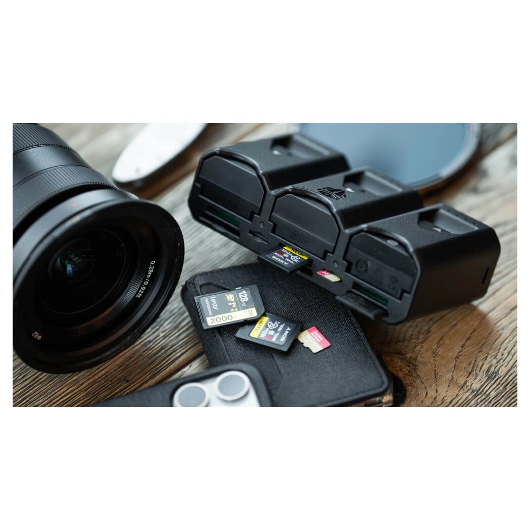 Naast het opladen van batterijen biedt de oplader ook handige opslagmogelijkheden voor je geheugenkaarten. Er zijn drie SD-slots, twee Micro-SD-slots en twee CFX-slots beschikbaar. Dit betekent dat je je geheugenkaarten altijd georganiseerd en binnen handbereik hebt. Geen zoektocht meer naar die ene belangrijke kaart; alles is netjes opgeborgen in één compacte eenheid.