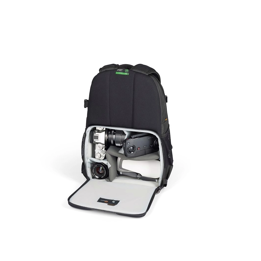 Deze compacte camerarugzak is ideaal voor crop-sensor mirrorless camera’s zoals de Fujifilm XT200 en Canon M50 MII, met ruimte voor lenzen, een 10” tablet, en zelfs een opvouwbare drone zoals de Mavic Air. Dubbele zijvakken houden een waterfles en compact statief vast.
