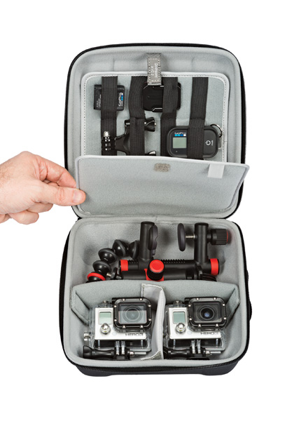 De Lowepro Dashpoint AVC2 Black is net als zijn kleine broer AVC1 een hardshell cameratas die speciaal ontworpen is om GoPro action cams met diverse GoPro accessoires mee te nemen. De binnenkant van deze bijzondere cameratas meet 21,3x 8,8 x 21,1 centimeter en biedt plaats aan twee GoPro action cams en een behoorlijke hoeveelheid accessoires, zoals bevestigingsbeugels, een lader, kabels, accu’s en geheugen.