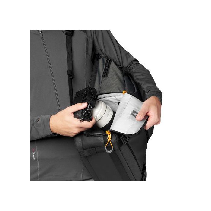 Het Lowepro Quickdoor systeem geeft in twee stappen toegang tot je camera gear. Door slechts een gedeelte van het vak aan de zijkant te openen kun je makkelijk en snel bij je camera. Om je tas in te richten of bij de rest van je apparatuur te kunnen, kun je de rest van de Quickdoor ook openritsen. De twee Quick Release Buckles en de veiligheidsclip aan de binnenkant moet je hiervoor eerst los maken. De buckles zijn gemakkelijk los te klikken met handschoenen aan. Het cameravak is goed beveiligd als je een grote ritstrekker door een Quick release buckle steekt en vast klikt. Dit maakt het onmogelijk om ongemerkt bij de camera apparatuur in het onderste gedeelte te komen.