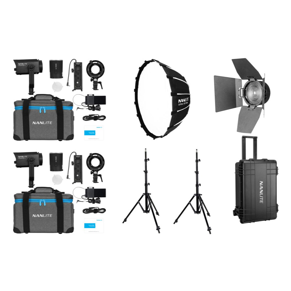 Inclusief 2x Nanlite Forza 60 II, 2x Batterijgrip, 2x Stroomkabel, 2x Stroomadapter, 2x Reflector, 2x Bowens Mount Adapter, 2x COB berschermkamp, 2x Draagtas, 2x Koffer, 2x Nanlite LS-186 lampstatief, Nanlite 60cm softbox en Fresnel.
