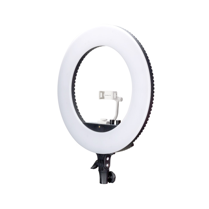 De 18″ Halo Bi-Color Ring Light Kit met Stand van NanLite maakt deel uit van een serie LED-ringlichten die zeer geschikt zijn voor schoonheidsverlichting, vloggen, selfies, haardressing, make-uptoepassing, portretfotografie en meer. it, de 18-inch ringlamp biedt uw afbeeldingen de kenmerkende, aantrekkelijke, zachte, bijna schaduwloze lichtkwaliteit met interessante ringvormige catchlights die het kenmerk zijn van de vorm van dit armatuur.