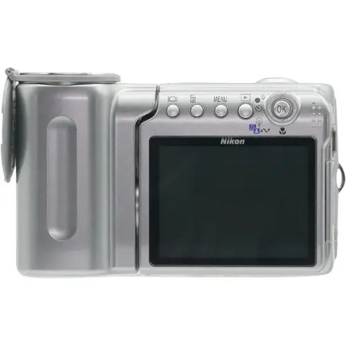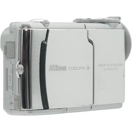 Nikon Coolpix S4 digitale camera met 6 MP CCD-sensor, 10x optische Nikkor zoomlens, swivel-ontwerp, D-Lighting en Face-priority autofocus. Conditie: De camera werkt naar behoren, heeft rondom gebruikerssporen, krassen en lakschade op de behuizing. Bekijk de afbeeldingen voor een betere indruk van de staat.
