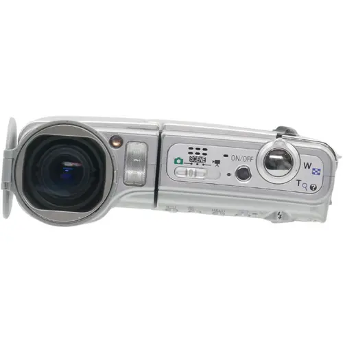 13,5 MB intern geheugen. De camera werkt op twee AA NiMH-batterijen, wat handig is