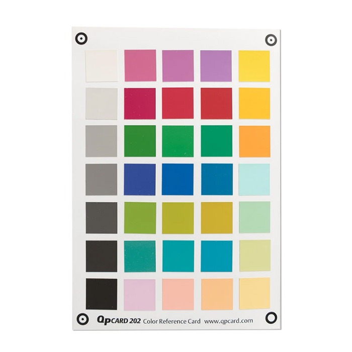 QPcard 202 is een kleurenreferentiekaart die een eenvoudige manier biedt om nauwkeurige kleuren uit uw digitale camera te halen. De kaart bevat 35 referentievlakken op een grote kaart van 240 x 170 mm, 28 kleuren en 7-staps zwart-naar-wit grijstinten.