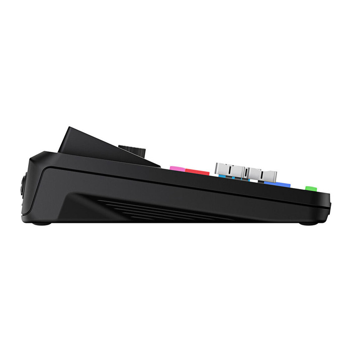 De 7-kanaals mixer heeft fysieke faders en virtuele kanalen. Elk kanaal heeft panregeling, mute-knop en luisterknop.