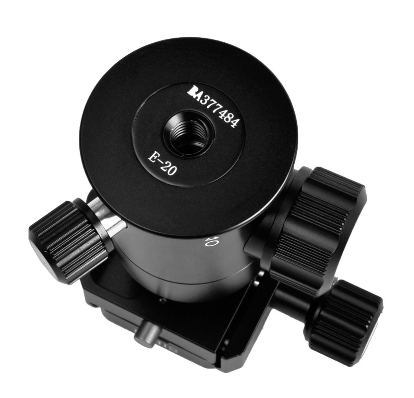 Het E-20 balhoofd heeft een waterpas bovenop de Arca-Swiss compatibel klem. Zo kunt u uw camera gemakkelijk waterpas zetten. De schaalverdeling in stappen van 5 graden op de basis van het balhoofd is zeer handig voor het maken van panoramafoto’s.