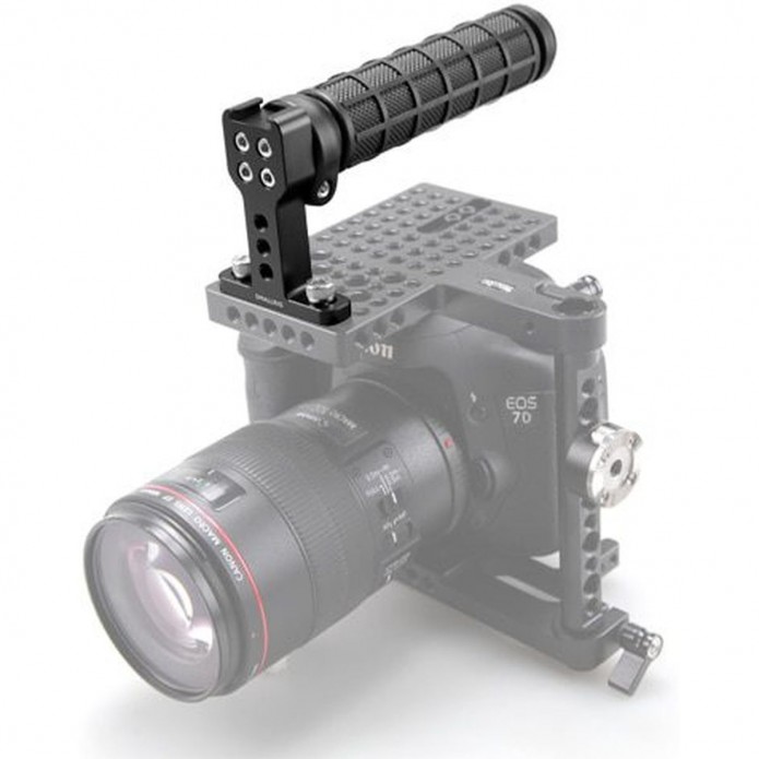 De SmallRig 1446 Top Handle kan met twee 1/4”-schroeven aan de topplaat van de cage worden bevestigd. Het biedt veel gemak bij het maken van opnamen uit de hand. De rubberen handgreep van goede kwaliteit ziet er zeer goed uit en het speciale ontwerp verhoogt de wrijving bij opnamen uit de hand. De top handle is uitgerust met een cold shoe voor het bevestigen van een microfoon en andere accessoires.