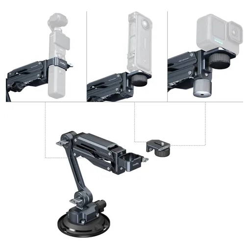Deze schokdemperarm is compatibel met meerdere actioncamera’s, waaronder de DJI Osmo Pocket 3, GoPro HERO13 en Insta360 X4, en ondersteunt ook camera’s met een 1/4″-20 schroefdraadgat. Dankzij de verstelbare vacuümzuignap met krachtige zuigkracht kun je je camera veilig bevestigen op verschillende oppervlakken, zoals voertuigen, zonder je zorgen te maken over stabiliteit.