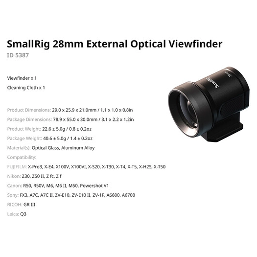 Met een gewicht van slechts 5 gram is de SmallRig 5387 Optical Viewfinder 28mm APS-C nauwelijks merkbaar op je camera. Hij schuift eenvoudig in de hotshoe van verschillende camera’s en biedt directe visuele feedback zonder vertraging. Deze zoeker werkt niet alleen met FUJIFILM, maar ook met andere merken, zolang ze een standaard flitsschoen hebben.