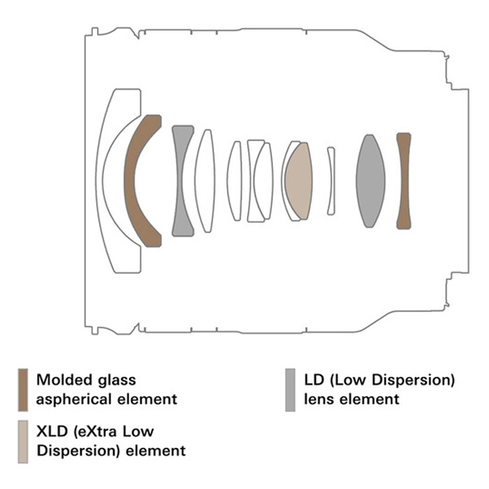 - XLD- (eXtra Low Dispersion), LD (Low Dispersion) en GM-elementen (Glass-Molded Aspherical) verminderen kleurverschillen, chromatische aberraties en beeldvervorming over het hele zoombereik aanzienlijk voor verbeterde helderheid en kleurnauwkeurigheid.
