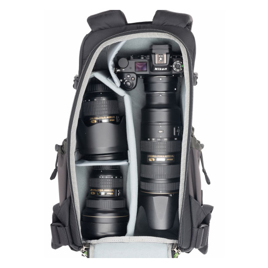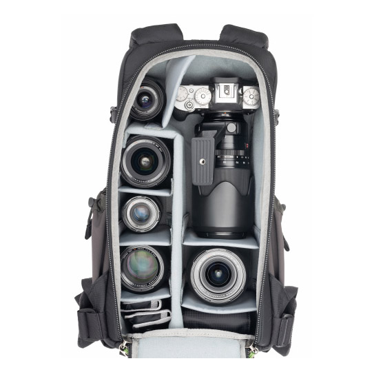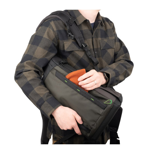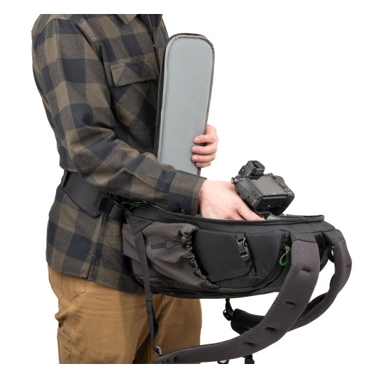 Met zijn slanke profiel biedt de tas ruimte voor een standaardformaat camerabody en een assortiment zoomlenzen. Het minimalistische maar luxueuze harnassysteem zorgt voor comfortabel dragen gedurende de hele dag. Grote zijzakken bieden plaats aan een 32 oz Nalgene-waterfles of kunnen worden gebruikt voor het dragen van een statief.