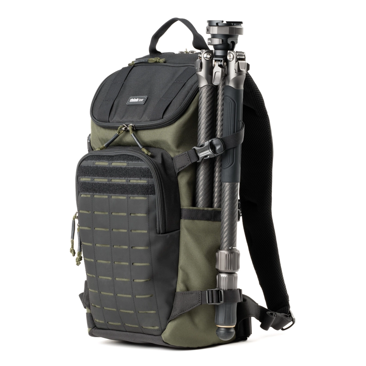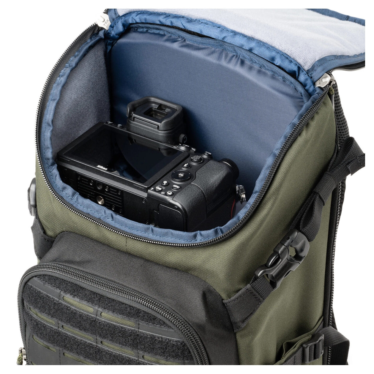 De Think Tank DarkLight Backpack 14L Montane Green is uitgerust met duurzame YKK-ritsen, een lasergesneden MOLLE-paneel en een bovenste toegangsklep. Tijdens een shoot haal je eenvoudig je camera eruit via het achterpaneel, zonder de hele tas te openen.