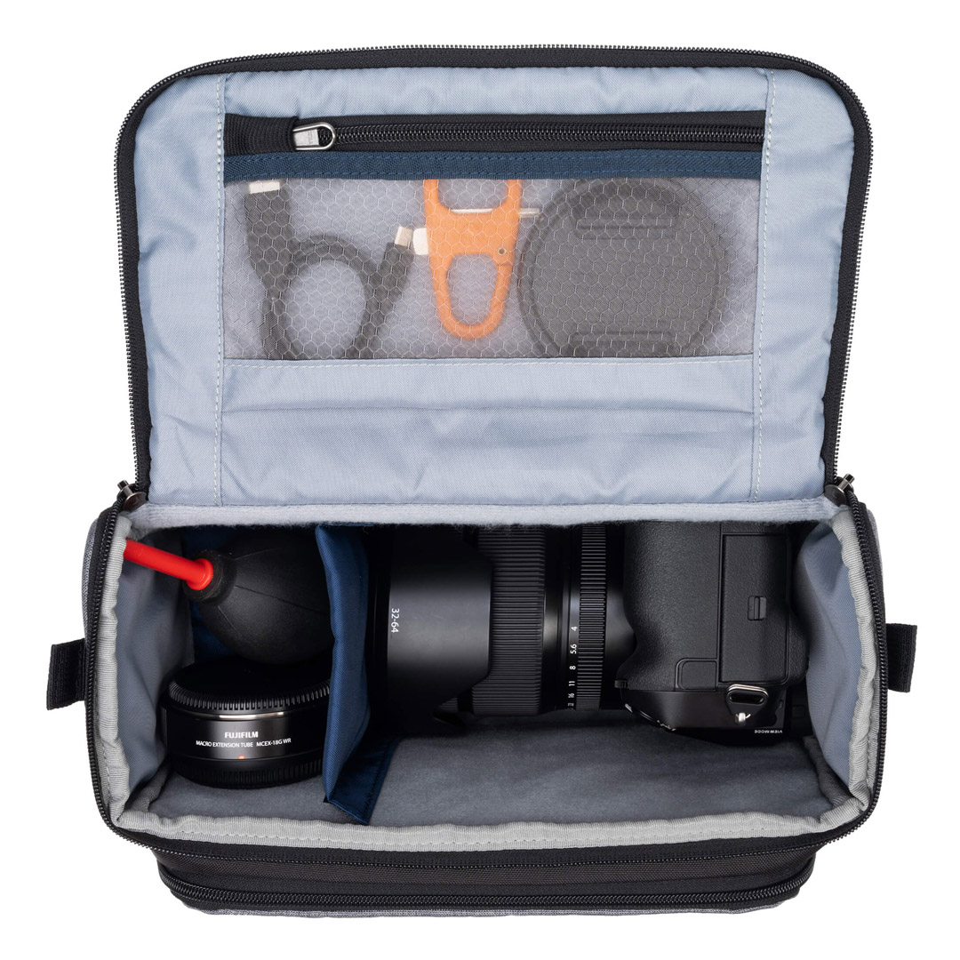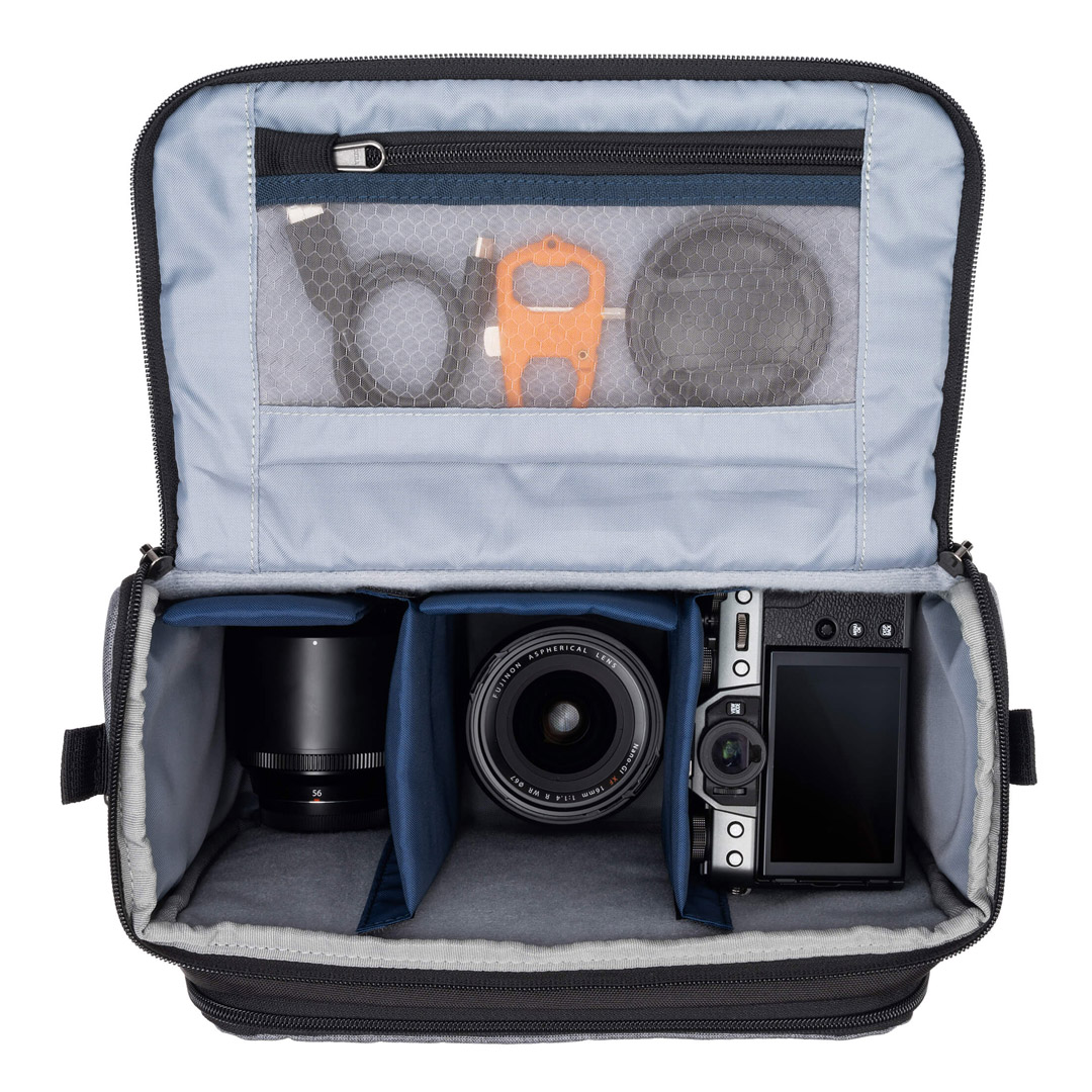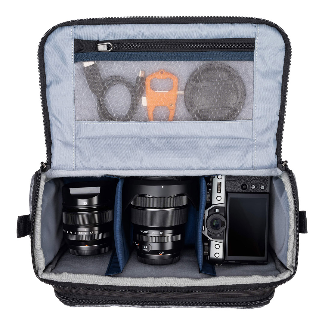 Deze tas is geschikt voor één standaard mirrorless body plus 2 tot 4 lenzen: korte tot middellange f/4 en f/2.8 zooms of korte tot middellange primes.