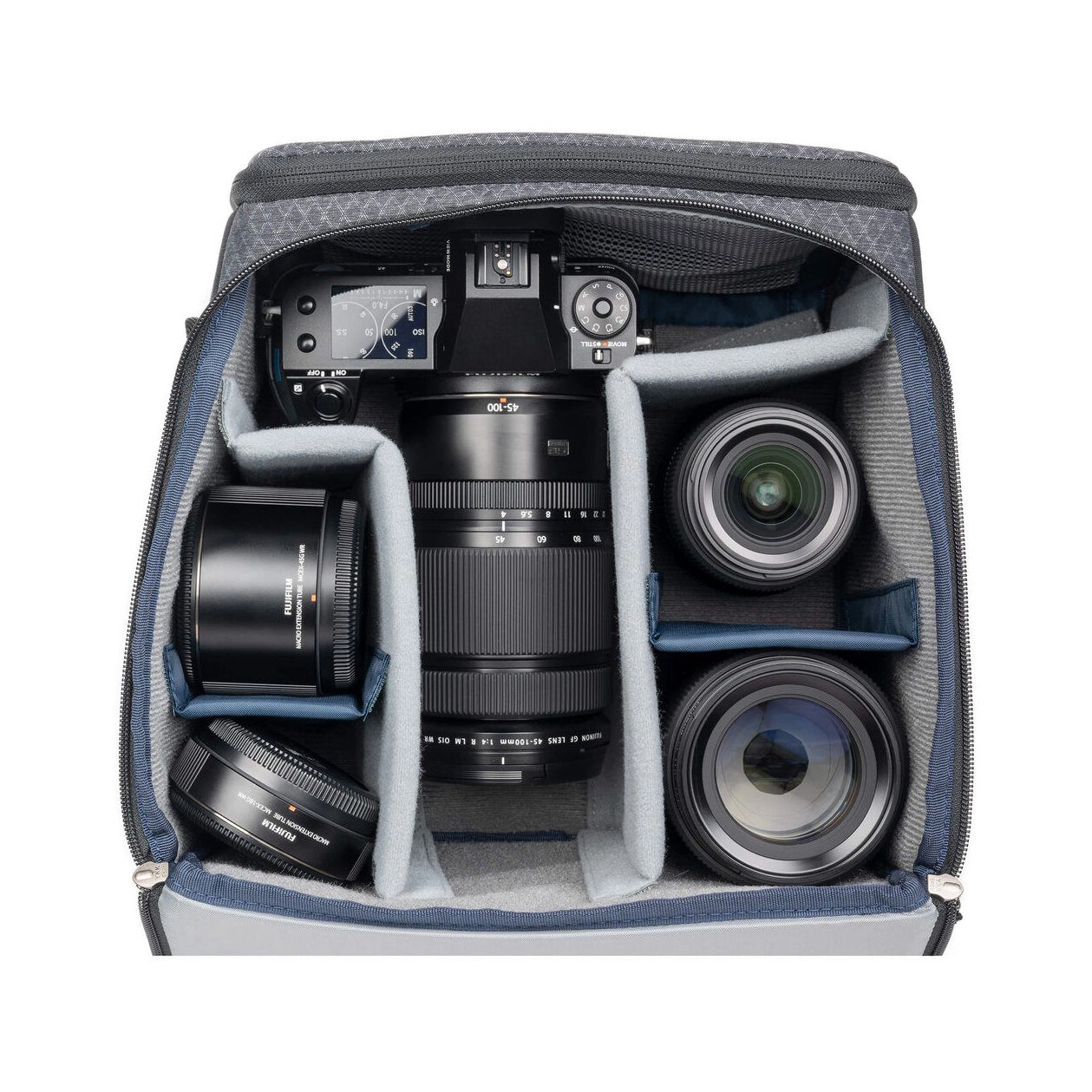 Deze cube biedt aanpasbare opslagruimte voor twee standaard camera’s en drie lenzen, compleet met een gaasvak met ritssluiting voor het veilig bewaren van kabels en kleine accessoires.