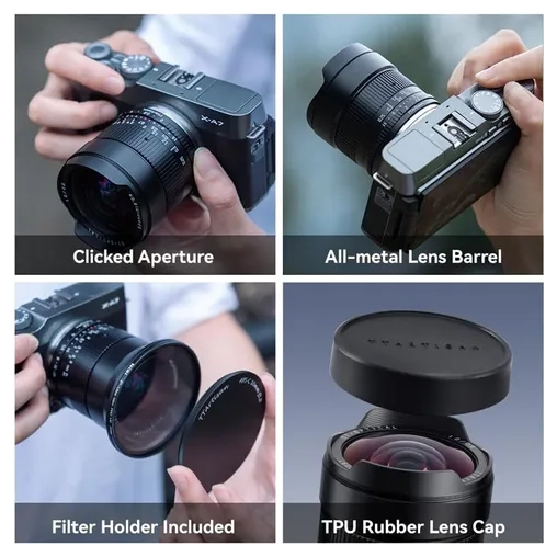 Deze compacte groothoek is vervaardigd uit een volledig metalen behuizing en ligt stevig in de hand. De handmatige scherpstelling werkt soepel en precies, wat fijn is bij landschappen of bij het filmen. Door het kleine formaat en lichte gewicht is hij een geweldige keuze voor wie vaak op pad is.