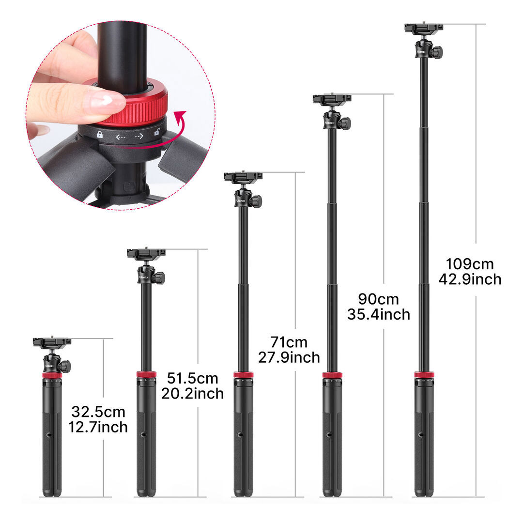 Het statief kan worden aangepast van een compacte 32 cm tot een indrukwekkende 110 cm, verdeeld over vier secties. Deze aanpasbaarheid maakt het gemakkelijk om de perfecte hoogte te vinden, ongeacht de omgeving. Van tafelbladniveau tot ooghoogte, het Ulanzi MT-44 statief biedt de juiste instelling.