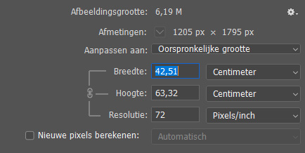(anders ga je het bestand aanpassen en dat willen we niet)[/vc_column_text][vc_empty_space height=”12px” ovic_vc_custom_id=”ovic_vc_custom_5e2063ec3117c”][vc_single_image image=”96444″ img_size=”full” ovic_vc_custom_id=”ovic_vc_custom_5e2063ec3117d”][vc_empty_space height=”12px” ovic_vc_custom_id=”ovic_vc_custom_5e2063ec3117e”][vc_column_text ovic_vc_custom_id=”ovic_vc_custom_5e2063ec3117f”]Nu zie je gelijk dat pixels bij breedte en hoogte omgezet worden van pixels naar centimeter en dat alles gekoppeld is (d.w.z. we veranderen nog steeds niets aan het bestand)